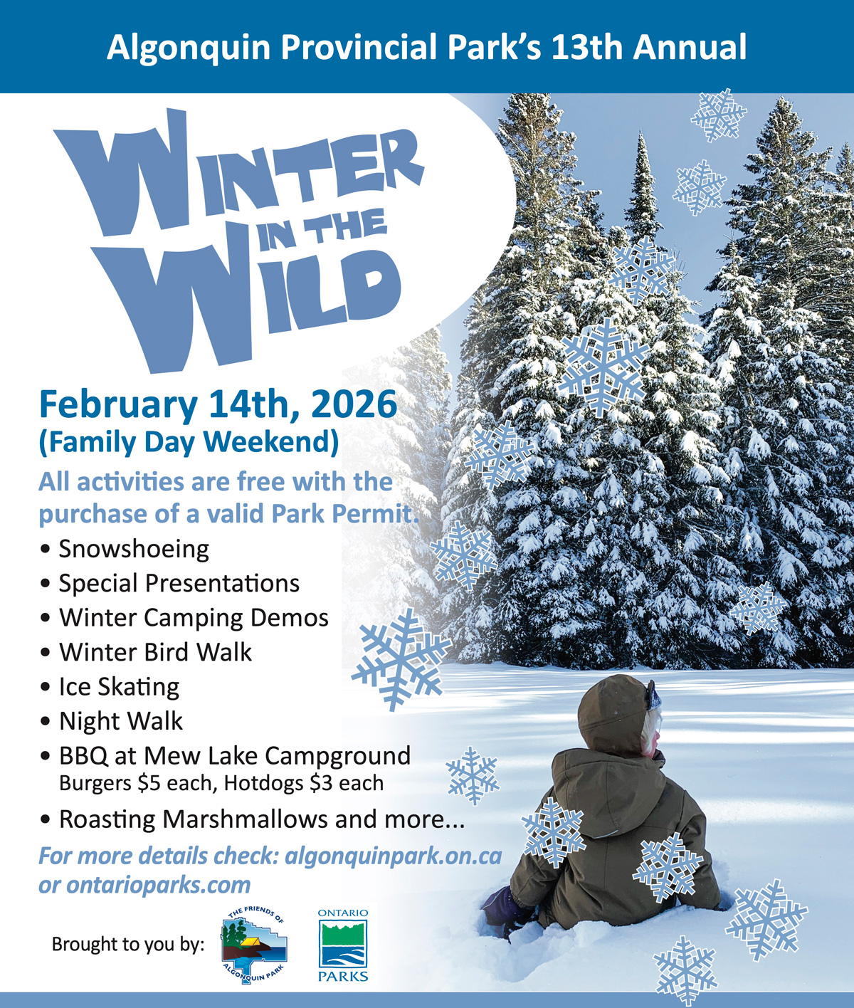 The Friends of Algonquin Park and Ontario Parks are proud to announce Winter in the Wild Festival happening in Algonquin Park on February 14, 2026 (the Saturday of Family Day Weekend). This family-friendly festival celebrates winter in Algonquin Park through indoor and outdoor events held at various locations throughout the Highway 60 Corridor of Algonquin Park, including many at the Algonquin Park Visitor Centre.